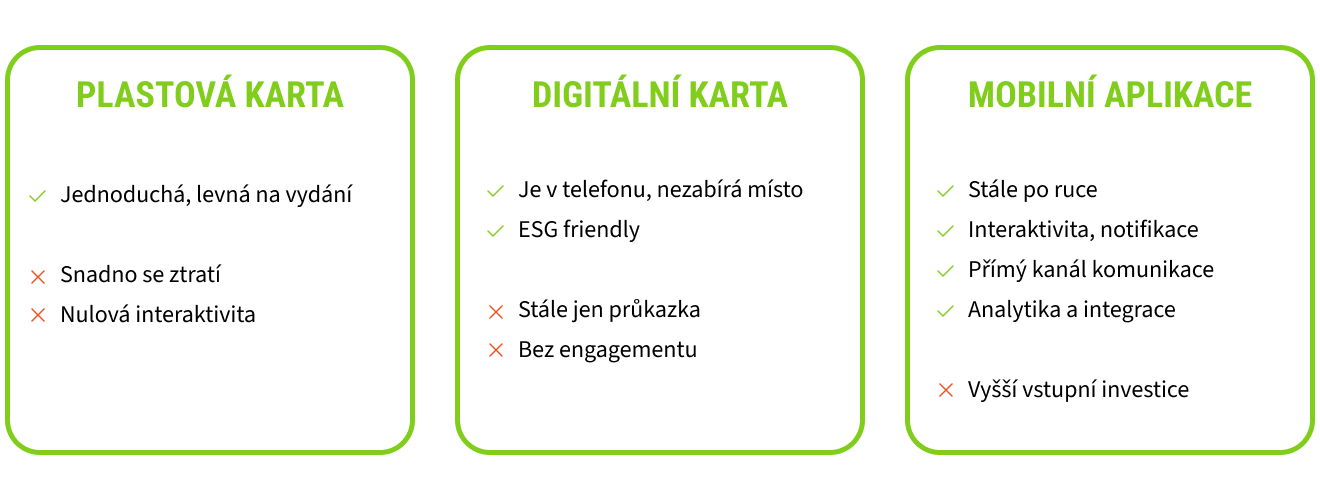 Modernější řešení, které odbourává potřebu nosit peněženku plnou plastu. Sama o sobě sice má nějaké možnosti engagementu a komunikace na zákazníka, ale jsou velmi omezené. Pokud není doplněná alespoň o online účet, funguje spíše jen jako zdigitalizovaná plastová karta.